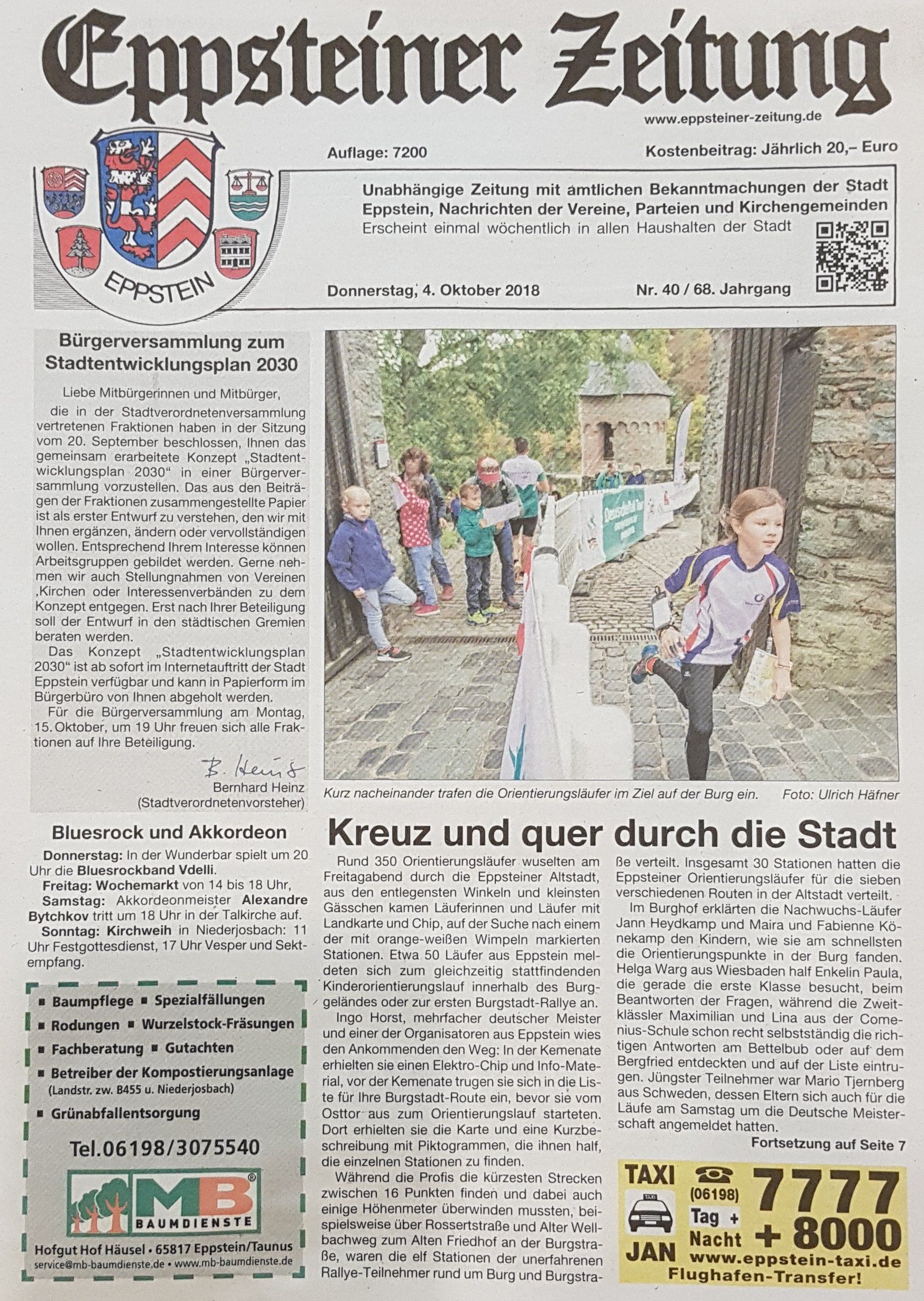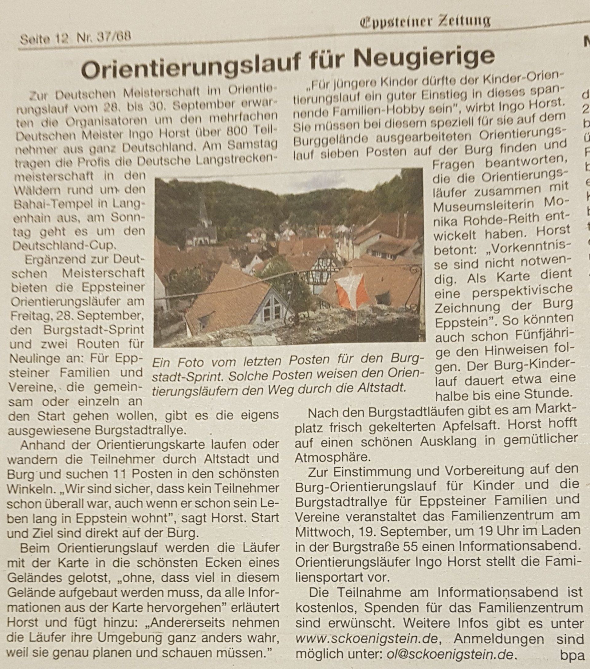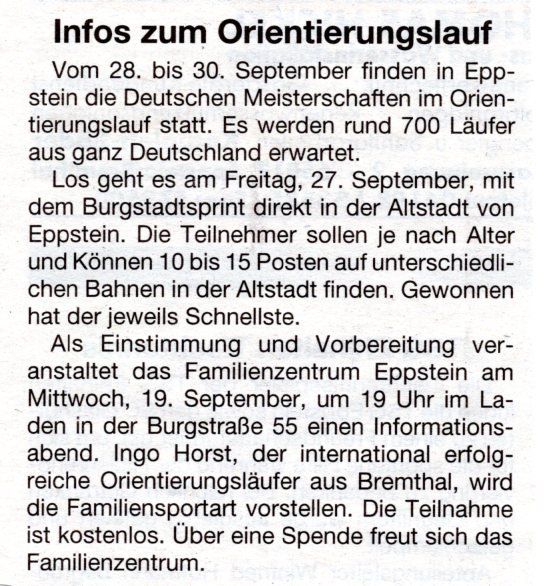 Mit einem Infostand auf dem Wochenmarkt, den viele der Läufer mehrfach passieren, wird auch für die Eppsteiner viel vom Orientierungslauf zu sehen sein, die bei einer Orientierungslaufrallye zum Ausprobieren unserer tollen Sportart animiert werden.