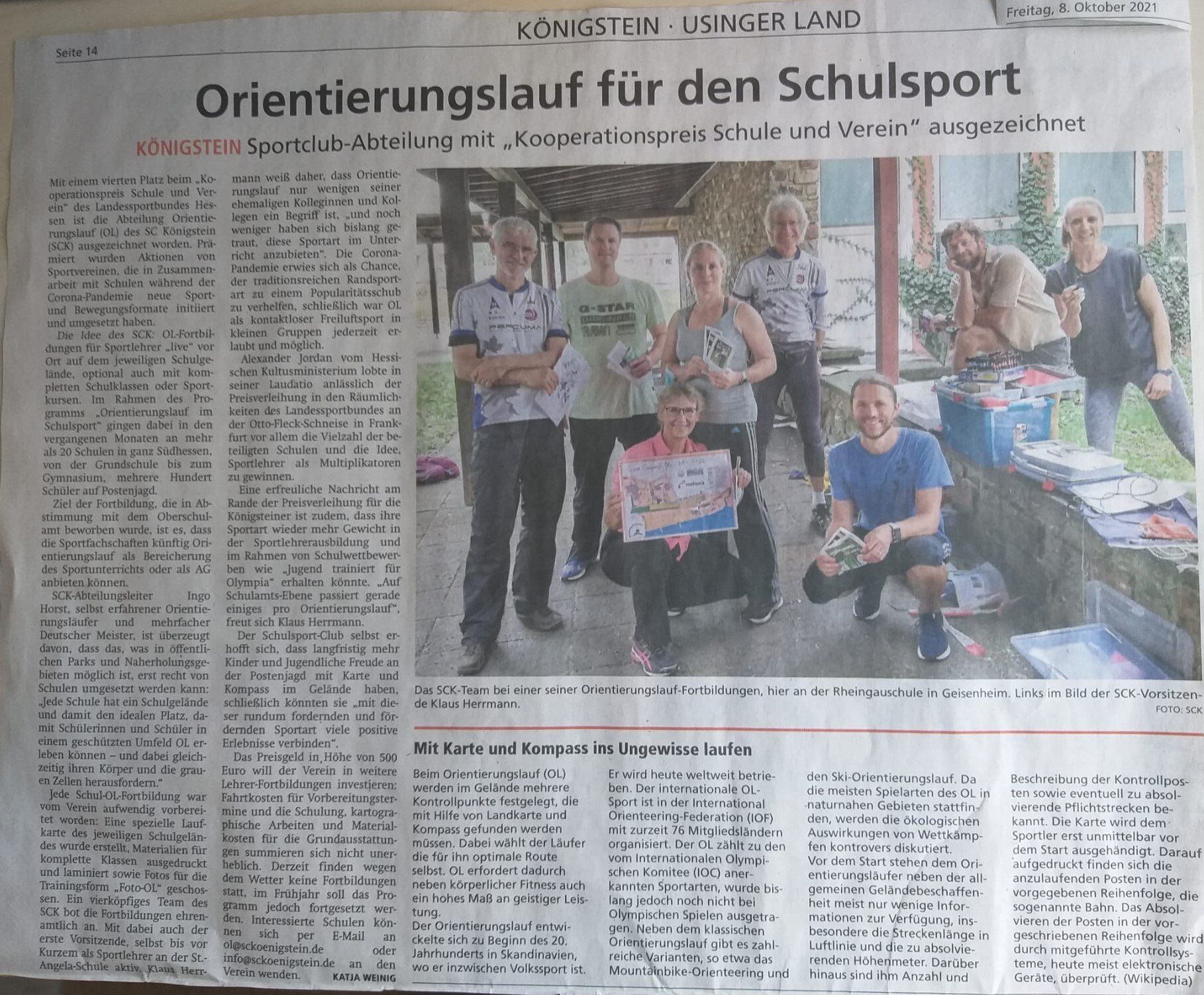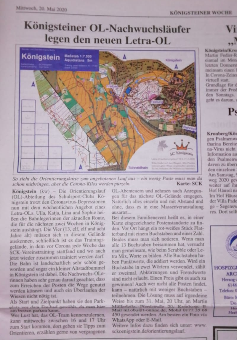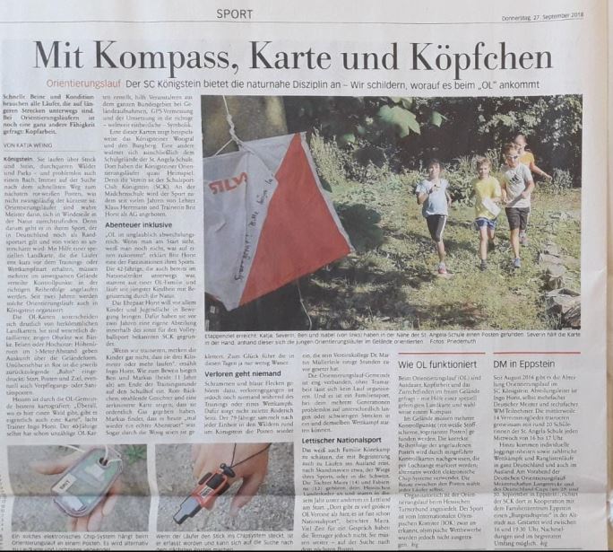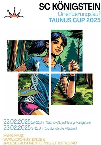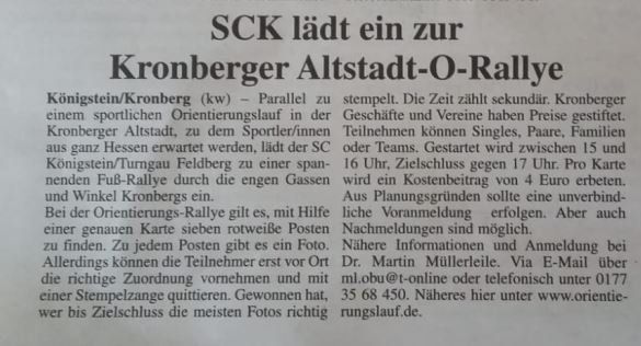 In Königstein und Eppstein gibt es seit 2016 die Möglichkeit, im Vereinstraining des SC Königstein diese schöne und abwechslungsreiche Natursportart zu erlernen. Treffpunkt ist immer mittwochs um 16 Uhr an der Turnhalle der St Angela-Schule für Erwachsene und Kinder ab 10 Jahren. Geleitet wird das Training von den erfahrenen OLern Brit und Ingo Horst, die schon so manchen OL- Titel eingesammelt haben. Erste Wettkampferfahrungen kann man am 30. März auf der Karte der Kronberger Altstadt sammeln. Start für diesen Sprint-OL mit besonderem Flair ist am Rathaus Kronberg zwischen 15:00 und 16:00 Uhr. Angeboten werden verschiedene Routen, von der Kinder- bis zur Seniorenstrecke. Die Ausschreibung findet man hier: Ausschreibung OL in Kronberg