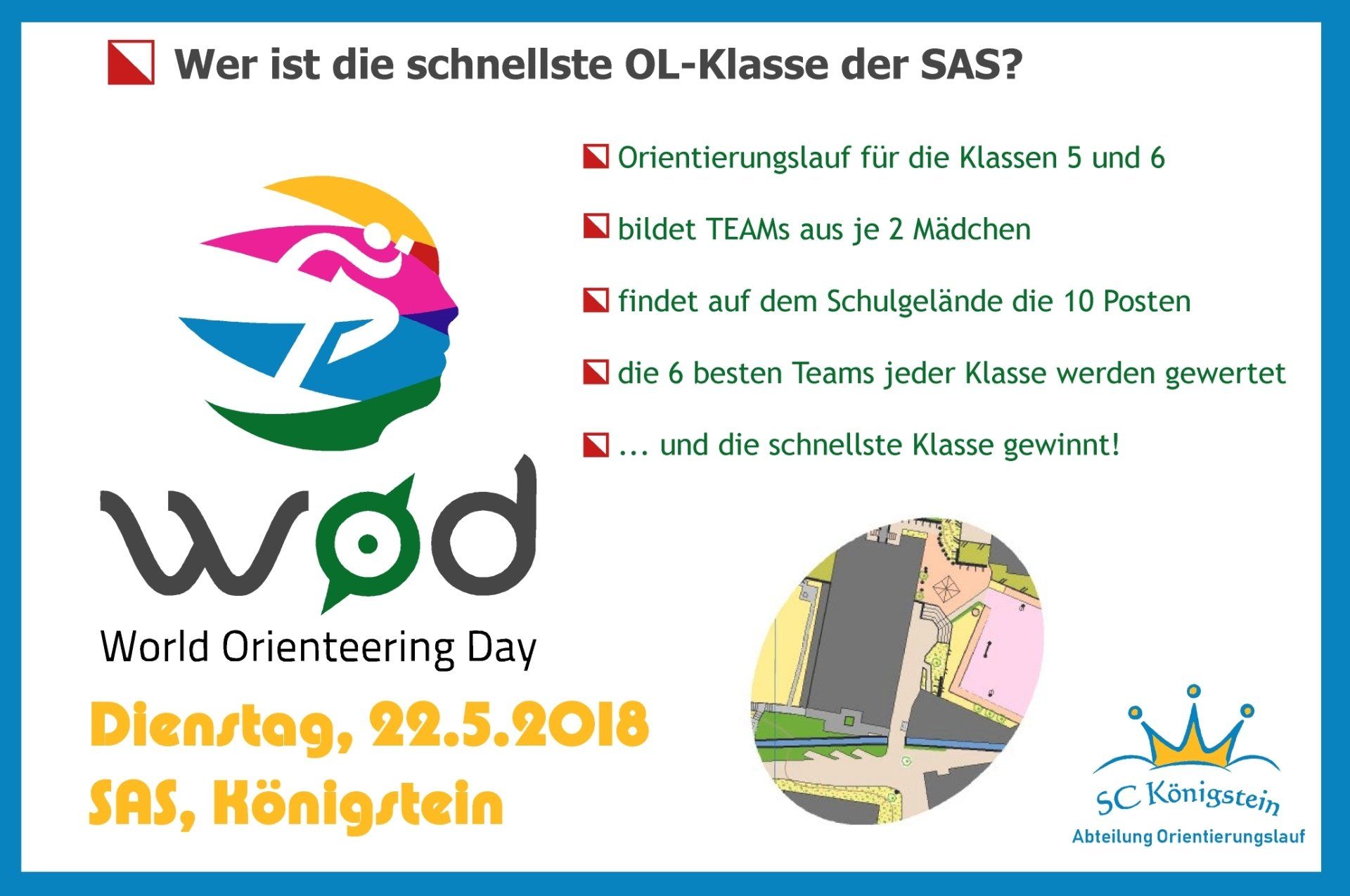 Damit alle 10 Klassen an einem Vormittag durchkommen werden immer 2 Klassen parallel starten. Damit sind wir Teil eines weltweiten Orientierungslaufprogramms in dieser Woche. Insgesamt werden weltweit rund 35.000 Schülerinnen und Schüler am World Orienteering Day teilnehmen!