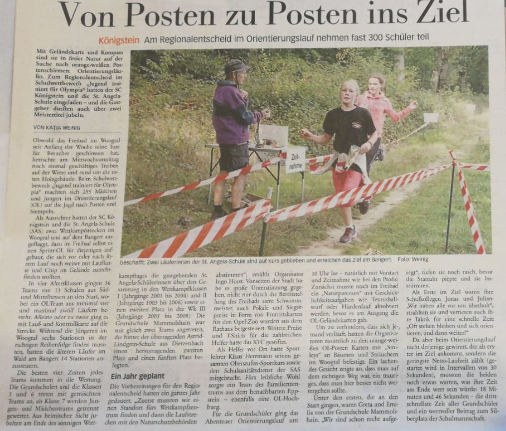 Unsere Schülerinnen der St. Angela-Schule waren nicht nur mit 3 Mannschaften selbst am Wettkampf am Start, sondern ein Sportkurs aus 20 Schülerinnen war auch an der Organisation der Veranstaltung beteiligt. Unterstützt wurde die Veranstaltung vom KTC Königstein, das Preise gestiftet hat sowie von der Stadt Königstein, die neben Unterstützung bei der Genehmigung, bei der Bereitstellung des Freibades auch die Pokale für die Siegmannschaften zur Verfügung stellt. Zu danken ist außerdem dem Forstamt Königstein in dessen Waldbereich die Veranstaltung durchgeführt wurde. Und natürlich den 30 ehrenamtlichen Helfern, die unsere Veranstaltung zu so einem Erfolg haben werden lassen.